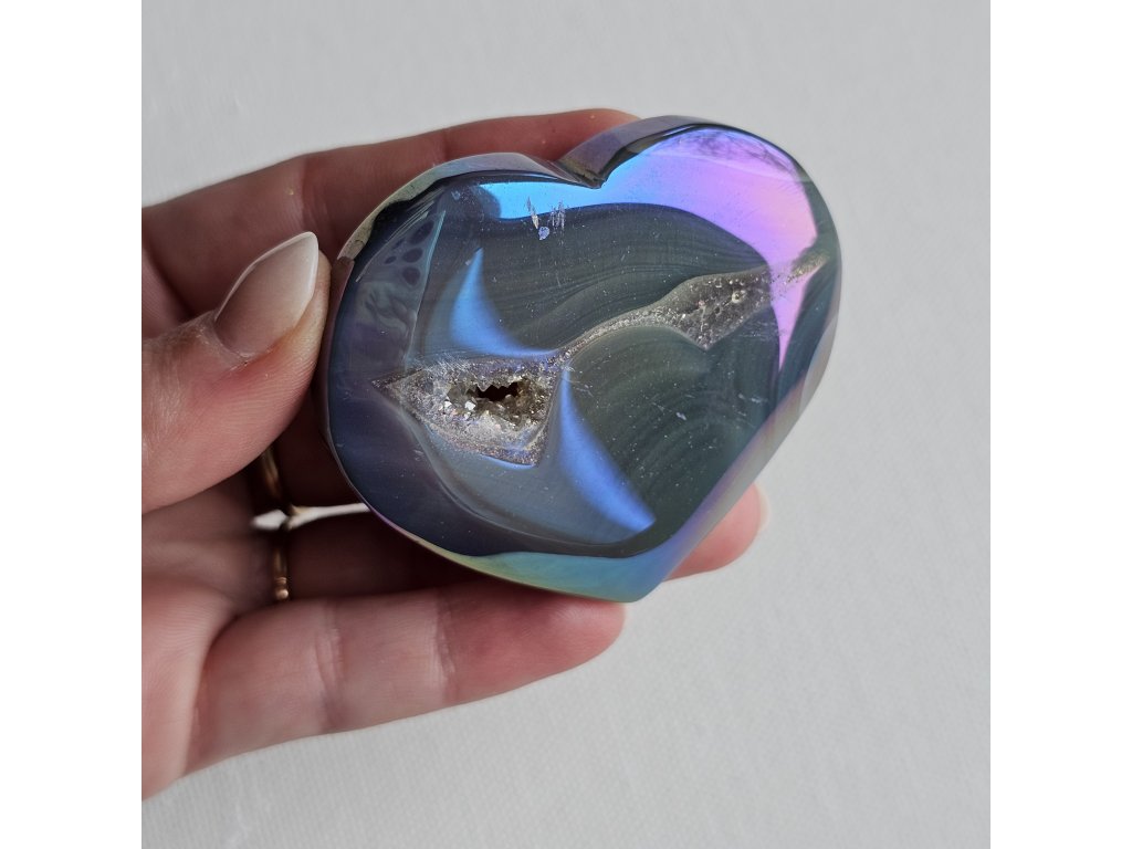🌈 Vyrovnání protikladů – spojuje stabilitu achátu s vysokými vibracemi Aqua Aura povlaku
