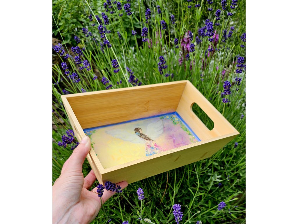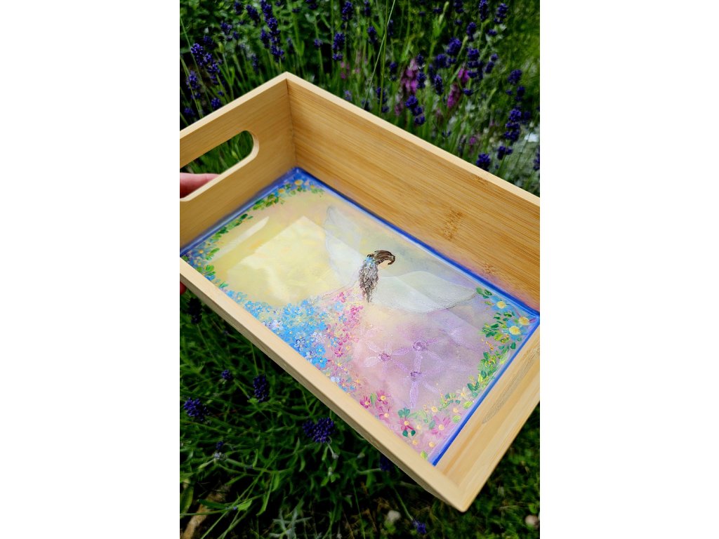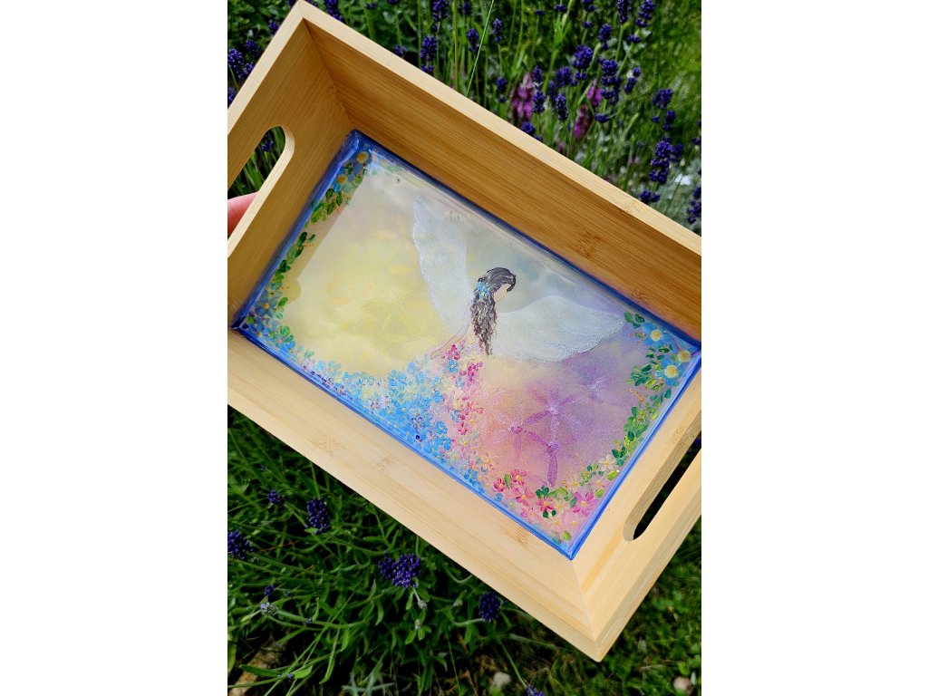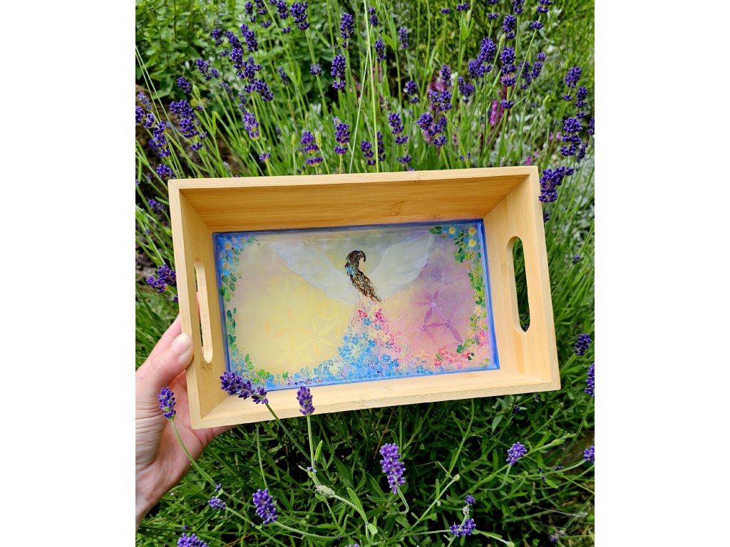 Dřevěný tác, s láskou a péčí tvořený, malovaný pod vedením andělů, ve kterém jsou zality ametysty, můžete využít jak na běžné servírování, tak i jako nabíjecí místečko pro drahé kameny a šperky