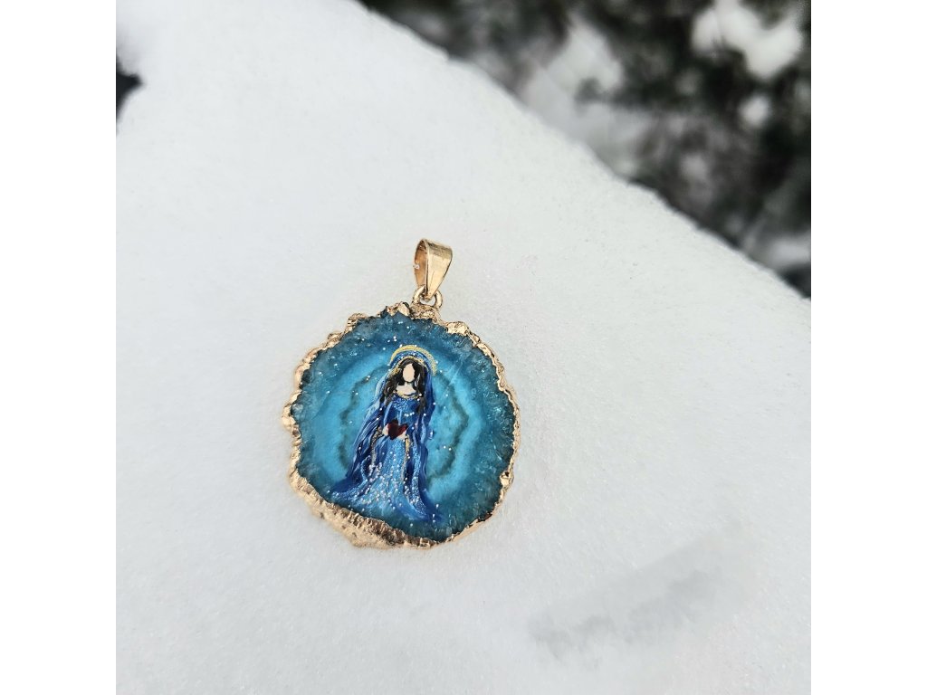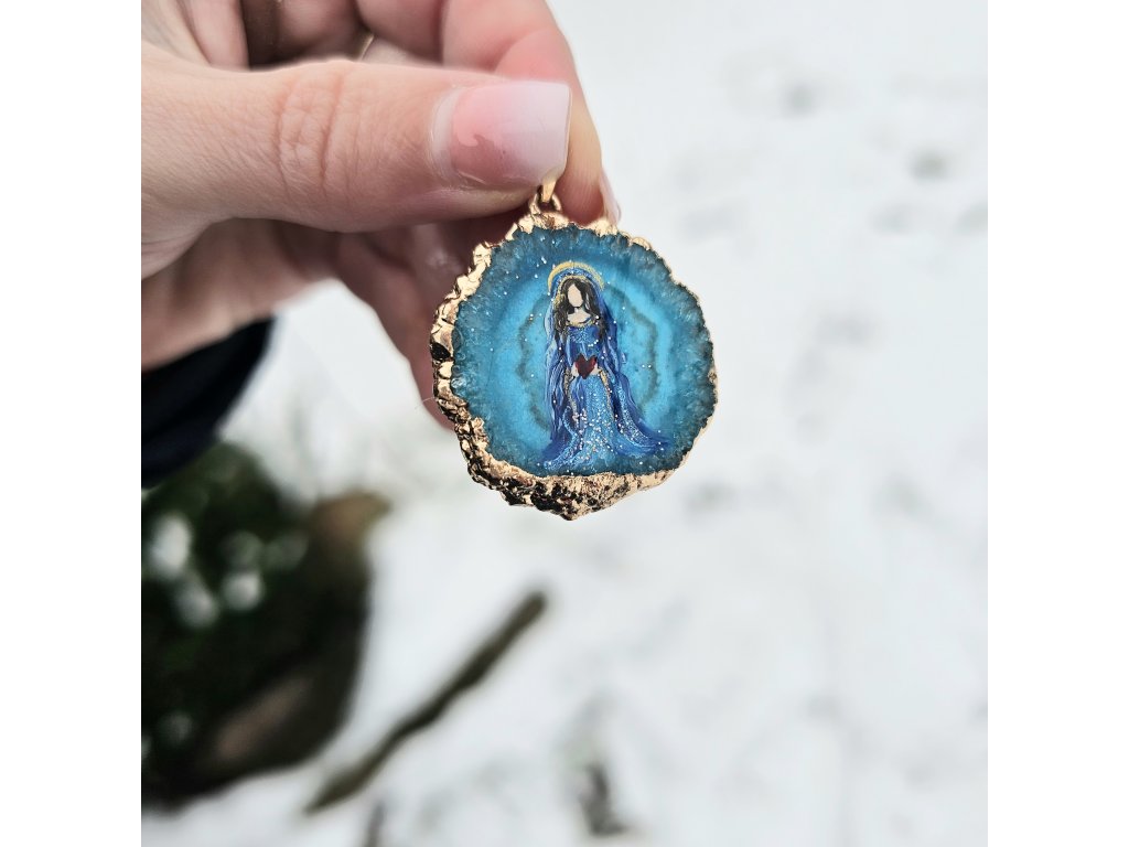 V jeho srdci září ručně malovaná podoba Panny Marie – Matičky čistoty, soucitu a bezpodmínečné lásky. V propojení její požehnané nebeské přítomnosti s achátem, který je bytostí Země, doslova přináší Nebe na Zemi🥰