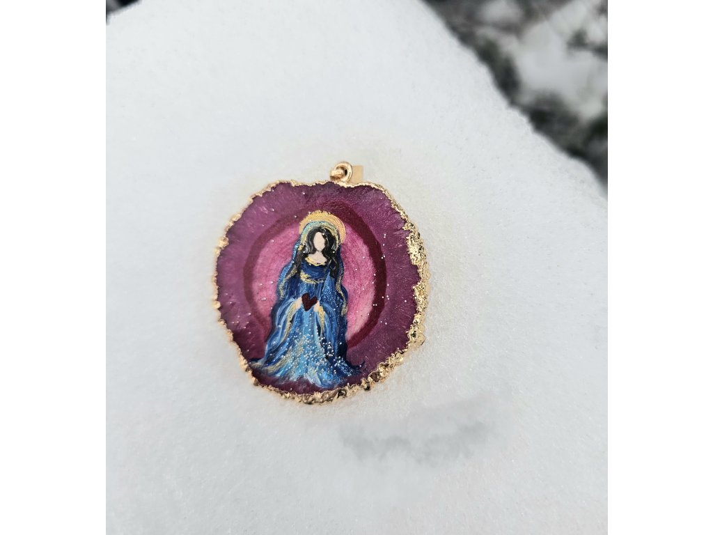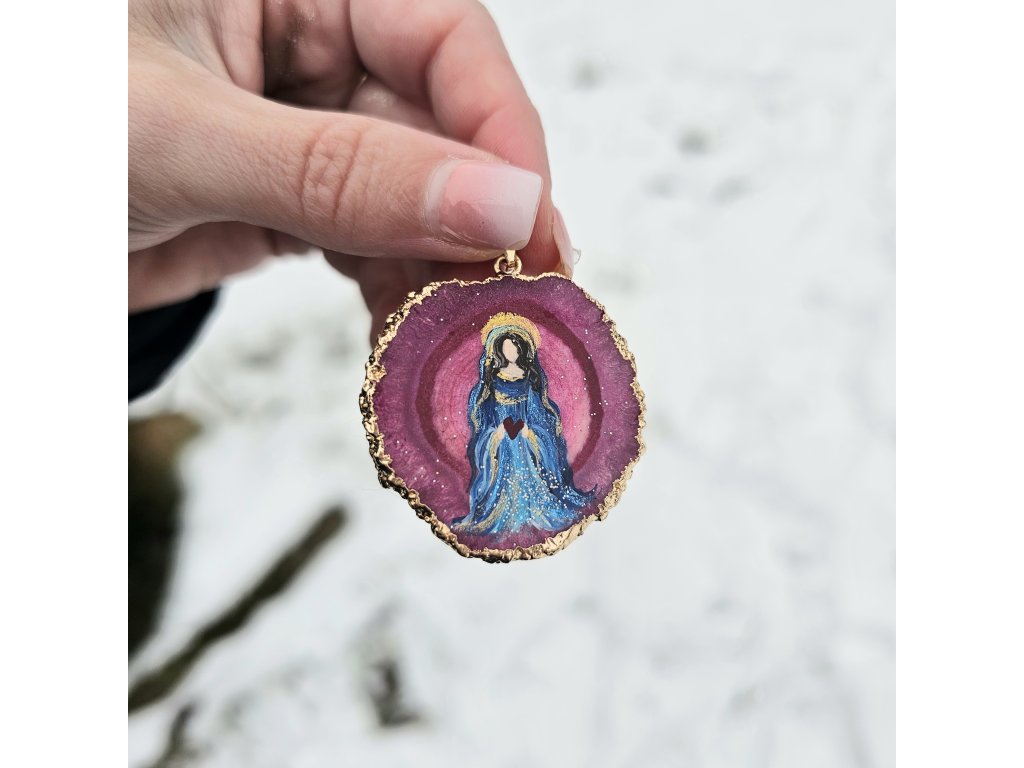 V jeho srdci září ručně malovaná podoba Panny Marie – Matičky čistoty, soucitu a bezpodmínečné lásky. V propojení její požehnané nebeské přítomnosti s achátem, který je bytostí Země, doslova přináší Nebe na Zemi🥰