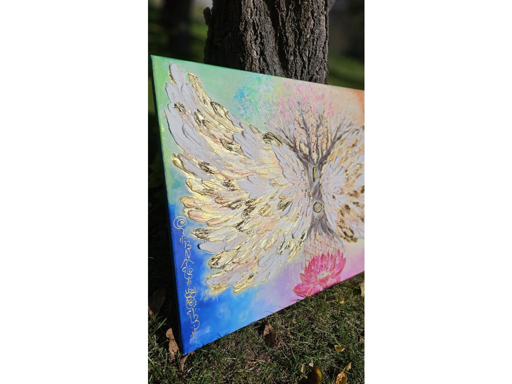 Křídla jsou tvořena 3D hmotou a vystupují do prostoru jsou zdobena zlatými plátky.