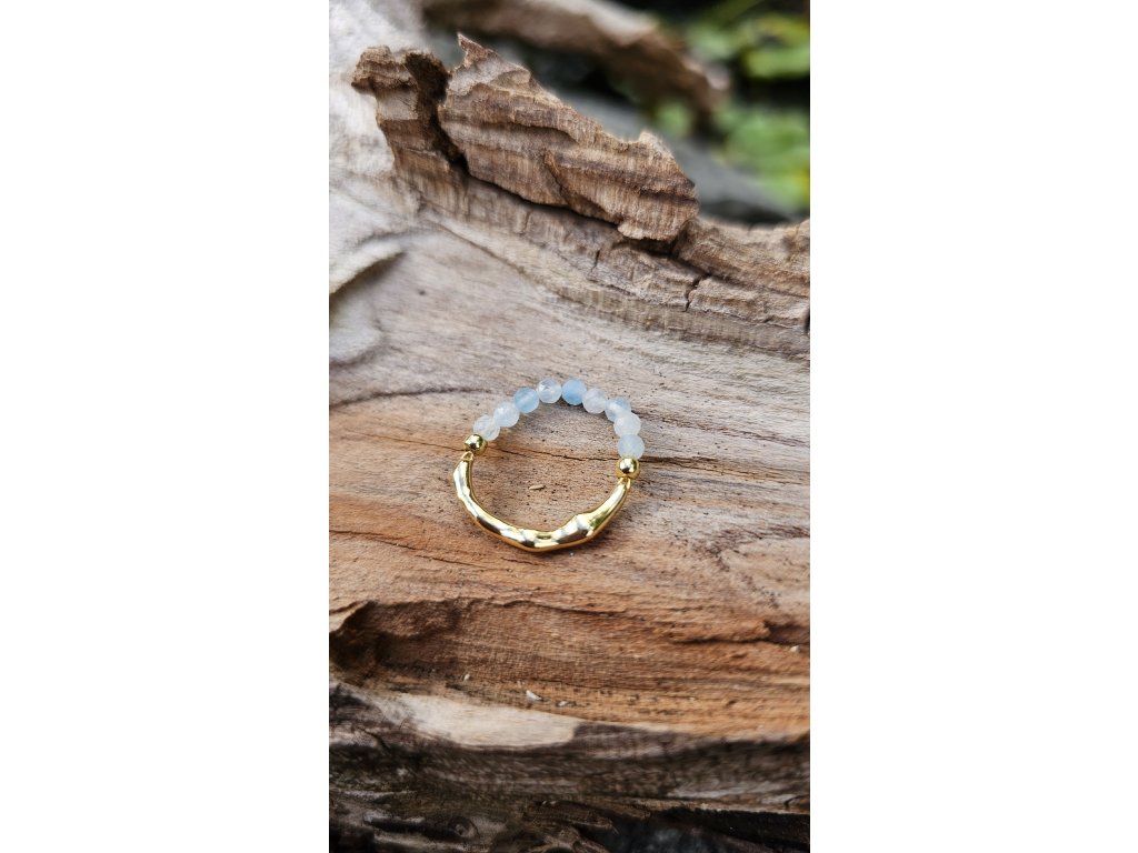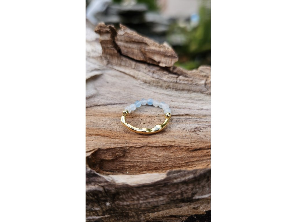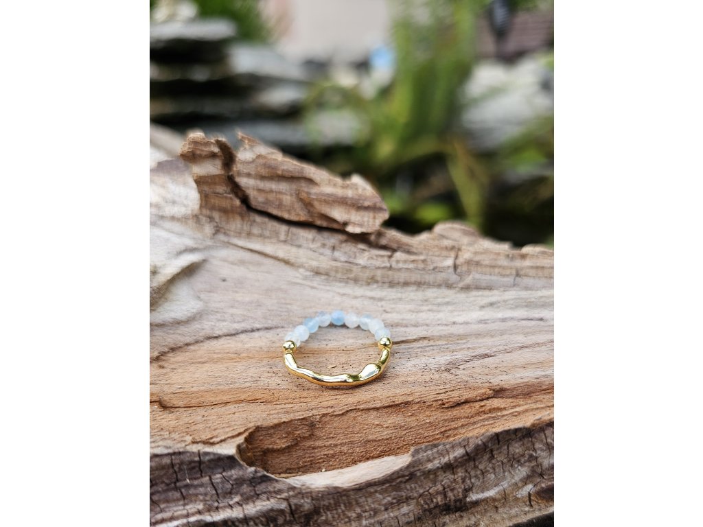 Prstýnek je tvořený fazetovanými korálky z přírodního akvamarínu a je zakončený elegantním pozlaceným prvkem s nepravidelným, téměř alchymistickým tvarem – jako by jej stvořil samotný čas.